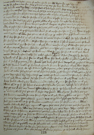 Se invece le case e i fienili fossero stati dirupati, guasti o danneggiati dalla parte guelfa, ciò nonostante siano tenuti Bertramo e Raimondo, loro eredi, successori ed aventi causa, al pagamento del fitto, in tal caso, cioè che da parte guelfa venissero guastati, dirupati e danneggiati i terreni, le case, i fienili e gli alberi in essi esistenti, Bertramo e Raimondo siano tenuti a rimborsare a Giovanni della Valle il relativo danno a giudizio di due buoni uomini arbitri eletti dagli stessi Bertramo, Raimondo e Giovanni concordemente”.