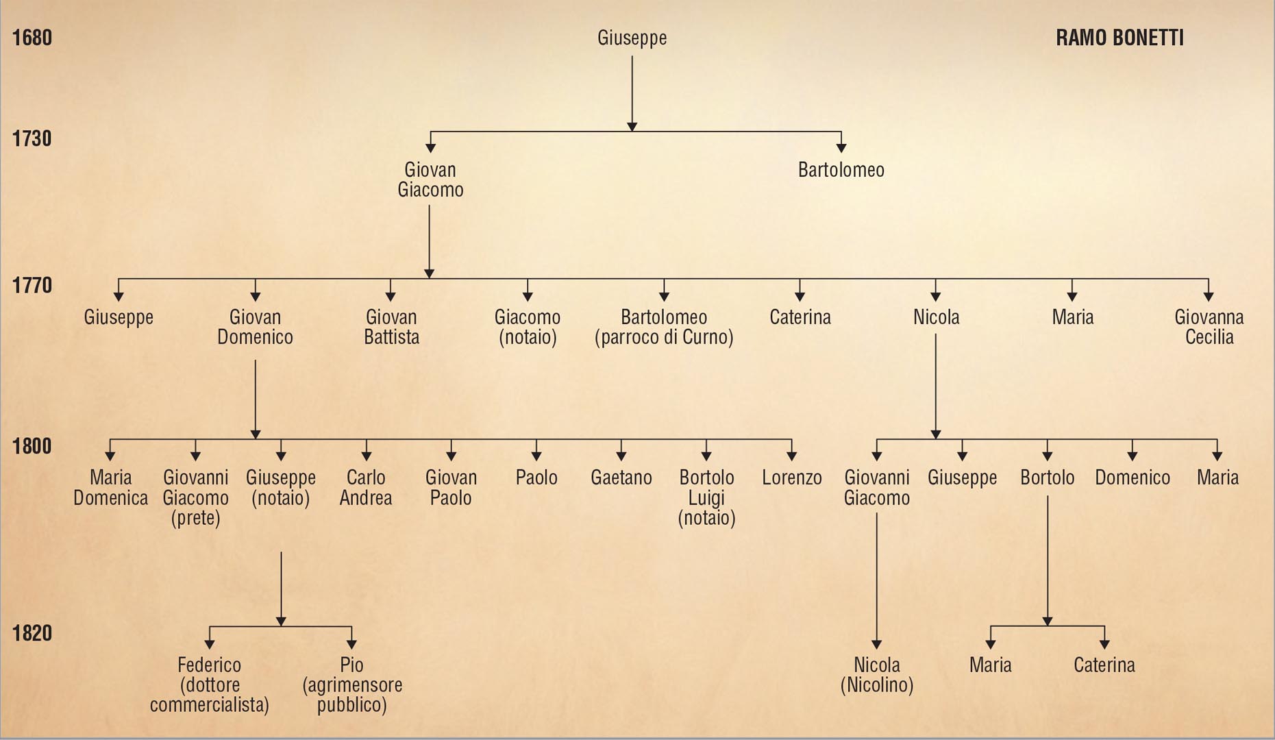 Tutto iniziò con Giovan Giacomo Bonetti fu Giuseppe nato nel 1699 a Baresi appartenente ad una famiglia collaterale dei notai Bonetti che svolsero la loro attività in questo paese tra la fine del 1400 e la fine del 1500. Divenuto proprietario di una casa e di vari terreni in contrada Ca Bonetti potè studiare per diventare notaio ma non svolse mai questa professione preferendo invece occuparsi di mediazione in varie attività commerciali. Lo troviamo infatti tantissime volte come primo testimone in rogiti, stipulati a Baresi in questa contrada da suo figlio Giacomo divenuto effettivamente notaio, per compravendite di case e terreni in Baresi e in altri paesi dell’alta valle sui quali egli aveva fornito consigli sui costi e la convenienza degli acquisti. Lo troviamo anche come procuratore scelto da varie persone per fare compravendite di immobili a loro nome. Varie volte interviene come consigliere nella cessione di crediti tra privati come a Fondra, Valleve, Bordogna e Roncobello. Nel 1764 è assunto come testimone/garante per il pagamento di una grossa partita di ferro del valore di lire 2800 depositata presso certi Paganoni di Piazza Brembana. Infine egli ricopre varie volte in modo non consecutivo anche la carica di reggente e sindaco della veneranda chiesa di San Giacomo di Baresi e a tale titolo acquista terreni a favore della chiesa stessa o presta soldi della chiesa ad alcuni privati ipotecando dei loro beni mobili o stabili per garanzia. Egli stesso a volte presta direttamente dei soldi a dei privati nello stesso modo. Insomma Giovan Giacomo Bonetti durante la prima metà del XVIII secolo si configura come una persona particolarmente influente a Baresi e conosciuta in tutta l’alta valle [2]. (foto-01)