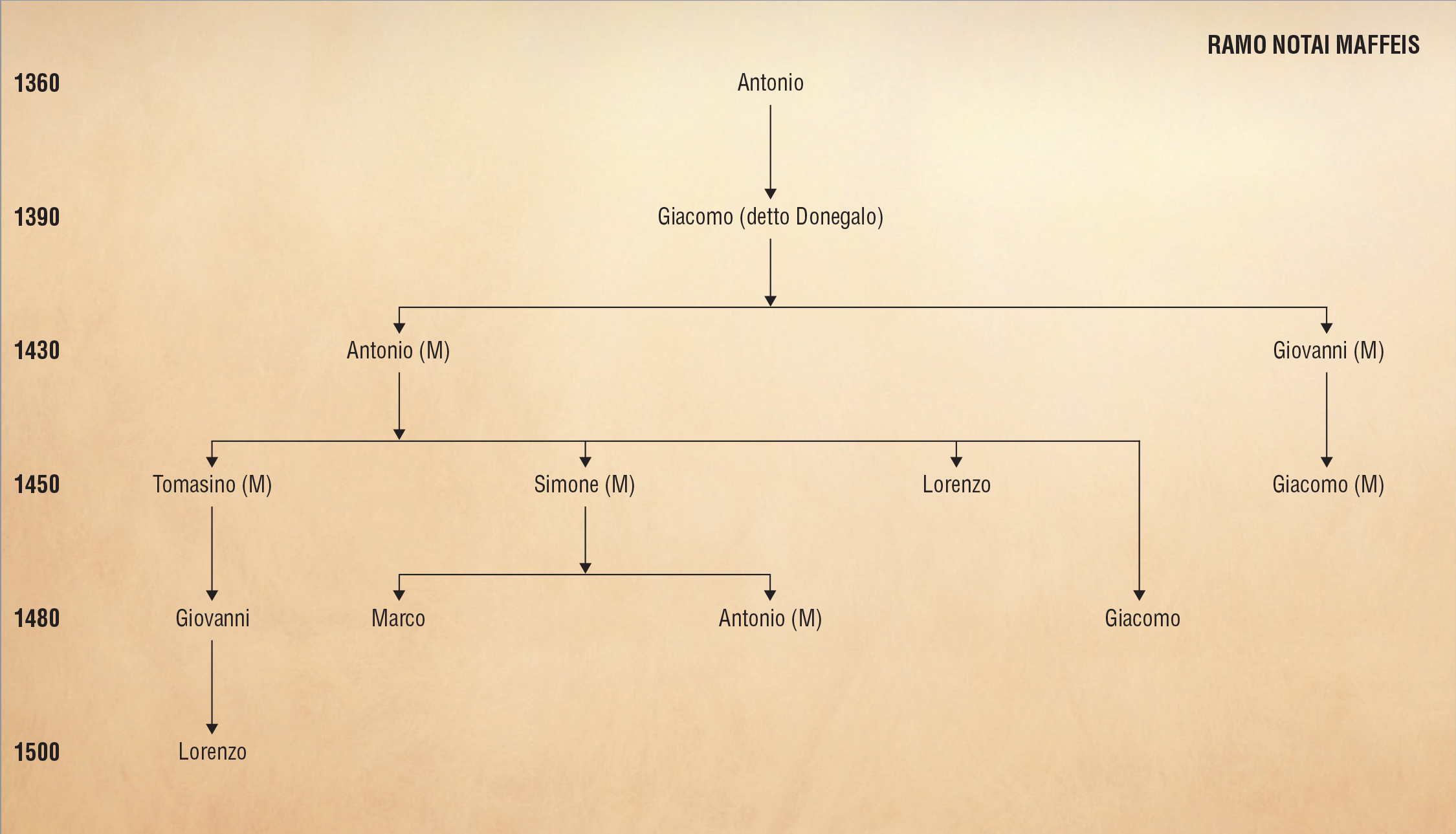 In effetti i vari maestri Maffeis sin qui incontrati non appartengono a famiglie diverse ma ad una stessa famiglia che aveva il suo capostipite in Giacomo Maffeis detto Donegalo fu Antonio che fu notaio a Zogno tra il 1380 e il 1429. Di lui ci è rimasto solo un volumetto di 60 pagine circa di rogiti datati tra il 1411 e il 1429 ma vari notai contemporanei o di poco successivi a lui referenziano i suoi numerosi atti a partire già dal 1380 [16]. Non è stato possibile sapere se egli fu anche maestro di scuola. Giacomo però ebbe due figli notai e maestri, Antonio e Giovanni, conosciuti entrambi nel documento iniziale del 12 marzo 1424 in cui Antonio appare come insegnante mentre Giovanni è presente come secondo notaio. Giovanni è confermato maestro più tardi a Nembro nel documento del 1463 citato sopra ma anche ad Albino il 14 novembre 1470 dove abita ma si tratta di una parentesi estemporanea cioè di una emigrazione non definitiva: egli infatti fu maestro in modo occasionale anche a Zogno e così lo fu anche un suo figlio: Giacomo. Anche di Antonio e di Giovanni purtroppo non sono rimasti rogiti ma sono numerosissimi gli atti di entrambi con date che si spingono sino al 1450 e oltre referenziati da altri notai a loro contemporanei o di poco successivi senza dire che varie volte essi appaiono come secondi notai o come contraenti diretti in tali atti [17]. A sua volta come detto Antonio ebbe tre figli notai già conosciuti e tra questi con certezza uno, Tomasino, fu maestro non solo a Zogno ma anche a Endenna mentre Simone lo fu solo a Zogno. C’è da dire poi che anche il figlio Giacomino, citato come minorenne nel testamento del 7 maggio 1453, divenne notaio sul finire del 1400. Simone ebbe a sua volta due figli notai, Marco e Antonio, dei quali il secondo divenne pure maestro di scuola. Di questi ultimi notai in Archivio di Stato di Bergamo sono presenti varie cartelle contenenti per ciascuna di esse centinaia e in alcuni casi migliaia di rogiti [18]. Giovanni fratello di Antonio conosciuto nel rogito del 12 marzo 1424 ebbe a sua volta almeno un figlio notaio, Giacomo, che divenne maestro a Nembro sulle orme del padre ma anche a Zogno come risulta dal suo ultimo testamento del 1479 redatto a Zogno e citato sopra. Di questo ultimo notaio e maestro non sono rimasti però documenti. Può essere utile rappresentare la struttura di questa famiglia relativa al XV secolo con un grafico illustrato nell’ultima immagine del presente scritto in cui sono stati indicati solo i notai ed eventualmente i maestri trascurando, per motivi di semplicità, ad ogni livello vari fratelli dediti ad altre attività e alcune sorelle andate spose ad altre famiglie influenti di Zogno e di altri paesi della valle.