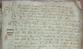 16 - ASBG. FN. Maffeis Giacomo fu Antonio di Zogno, c. 164/B. Panizzoli Antonio fu Pietro di Zogno, c. 107, vol. 1390-1393, atto 09/01/1390 pag. 10. Vedi inoltre Zogno Notizie n. 5, ottobre 1991: Scoperte antiche miniature tra gli atti di un notaio di Zogno di Giuseppe Pesenti e Franco Carminati, pag. 21 e ss.